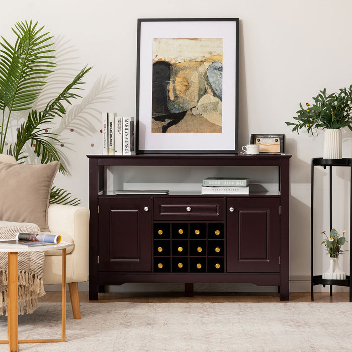 The console table is a treasure trove of storage. It boasts 2 enclosed cupboards perfect for stowing away your fine china, a smooth sliding drawer for cutlery and small items, and a dedicated wine rack that cradles up to 12 bottles of your favorite vintages. The spacious top shelf and tabletop offer ample room for decanters, glasses, and appetizer trays, making hosting a breeze.