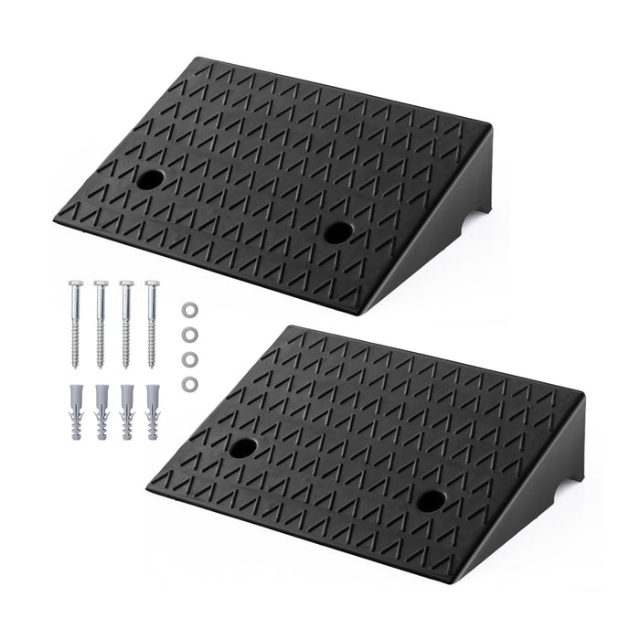 Crafted from top-tier rubber, these resilient ramps withstand the ravages of time and the elements with 3T max load, ensuring your vehicle transitions smoothly over any obstacle. The anti-slip texture and base grid design provide vehicles and wheel-based equipment with unparalleled traction, reducing slippage and increasing safety. Moreover, the predrilled holes and accompanying bolts allow for secure and adaptable placement, whether for a short-term solution or a permanent fixture. You just need to punch a hole and tighten the screws into the pre-drilled holes. Compact and hassle-free, they’re readily storable and portable. Elevate your access with these essential tools for seamless movement across uneven surfaces. Durably Engineered Rubber: Made of high-strength rubber material, these ramps are waterproof, wear resistant and immune to cracks or shape changes, withstanding harsh weather over time. Each ramp supports up to 3T, ensuring safe passage over rough terrain.Enhanced Traction and Stability: The textured surface provides superior grip, while the grid pattern on the base enhances ground adherence for solid stability. And the considerate groove design will avoid accumulated water and protect hoses and wires.Multifunctional Curb Ramps: Designed with a gentle 20.5° incline, these ramps are perfect for driveway, threshold, parking lot, warehouse and so on, which create easy access for car, motor bike, scooter, wheelchair, etc. for diverse daily usage.Secure Installation Options: Equipped with predrilled holes and 4 expansion bolts, these ramps offer secure, either temporary or permanent, installation to suit various location needs, ensuring they stay firmly in place.Convenient Portability and Storage: Measuring 48 x 33 x 13 cm (L x W x H) each, the ramps are easy to store and transport in your vehicle’s trunk, ready for immediate use without the inconvenience of odors.