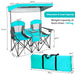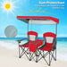This double sunshade folding chair will provide you with large shelter and comfortable outdoor experience. There is a beverage holder to keep drinks cool and cup holder on both armrests of chairs. If you are looking for a double folding camping chair like this, do not hesitate to place an order! ● Adjustable Canopy and Comfortable Seat: Comes with a top canopy, this camping chair will provide you with large area of shade on hot summer days. The adjustable design makes the canopy up and down to block the sun from any angle. Featuring breathable and ergonomic oversized seat and wide armrest, the picnic chair will provide excellent comfort for you. ● Premium Materials and Stable Structure: Made of black powder-coated steel and breathable oxford cloth, the double folding fishing chair is sturdy and anti-rust for long-term outdoor use. Plus premium connectors and stable frame, each sunshade chair can support up to 120 kg. ● Additional Cooler Bag and Cup Holder: This double folding chair is designed with a cooler bag in the middle table, which provides storage space and can keep the temperature of iced drinks. In addition, there are two handy cup holders on both armrests of the beach chair and a storage bag in front of cooler bag to place small items. ● Easy to Store and Carry: The foldable design and detachable canopy make this chair easy to store and save space, which is convenient to place in the car trunk or at home. In addition, the folding loveseat also includes a carrying bag that can store the chair for easy transportation. ● Simple Setting up and Versatility: It is easy to expand and fold the chair without tools. Just extend the chair and then assemble the canopy into the position. 2-person seating allows for bonding enjoying leisure time with friends, which is suitable for beach, park, courtyard, garden or other outdoor places.