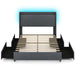 This sleek, modern bed frame lights up your world with its dazzling LED ambient lighting featuring over 60,000 colors. Control lights via an app or let them dance to your tunes for a show-stopping effect. The sumptuous wingback headboard isn’t just for show; it’s a haven of convenience with built-in storage and pockets for your essentials. Stay powered up with the integrated charging station equipped with everything for today’s gadgets. Say goodbye to clutter with discreet, spacious drawers making organization effortless. And rest easy on the robust frame that promises noise-free stability without needing a box spring. Transform your sleep into an experience—elevate your space now! Illuminate Your Space: Step into a world of color with the bed frame’s LED Ambient Lighting! Up to 60,000 shades at your fingertips, controlled by app or remote. Sync your lights to music or voice for a truly immersive experience. Upholstered Wingback Headboard: The platform bed includes a luxurious wingback headboard covered with breathable linen fabric. With an integrated storage shelf and 2 convenient pockets, the headboard ensures easy access to items like books or phones. Charge Up and Stay Connected: Never run out of power again with the upholstered bed’s built-in charging station. 2 AC outlets, a USB and Type-C port will keep your gadgets charged, decluttering your space for a sleek, modern look. Effortless Storage: Discover the convenience of this storage bed frame. Four spacious drawers with wheels offer ample storage, accessible without moving a muscle, keeping your room organized effortlessly. Solid Support for Restful Nights: Enjoy the peace of mind that comes with the reliable construction. Plywood slats and sturdy metal legs ensure a stable bed, eliminating the need for a box spring. The noise-free design ensures a quiet, uninterrupted sleep.