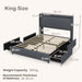 Colour: Grey Material: Plywood, Sponge, Polyester Linen Fabric, MDF, Metal Double Size Overall Dimensions: 210 x 145 x 122 cm (L x W x H) Net Weight: 51 kg King Size Overall Dimensions: 223 x 161 x 122 cm (L x W x H) Net Weight: 53 kg Headboard Depth: 20 cm Headboard Shelf: 10 x 12 cm (D x H) Headboard from Bed Platform: 30 cm Footboard Height: 30 cm Interior of Drawer: 73 x 51 x 12 cm (W x D x H) Recommend Thickness of Mattress: 20-25 cm AC Outlet: 220-250V 50/60Hz USB Port: 5V/Max 2.1A Weight Capacity: 500 kg Package Includes: 1 x Upholstered Bed with 4 Drawers 1 x Remote Control 1 x Instruction Manual