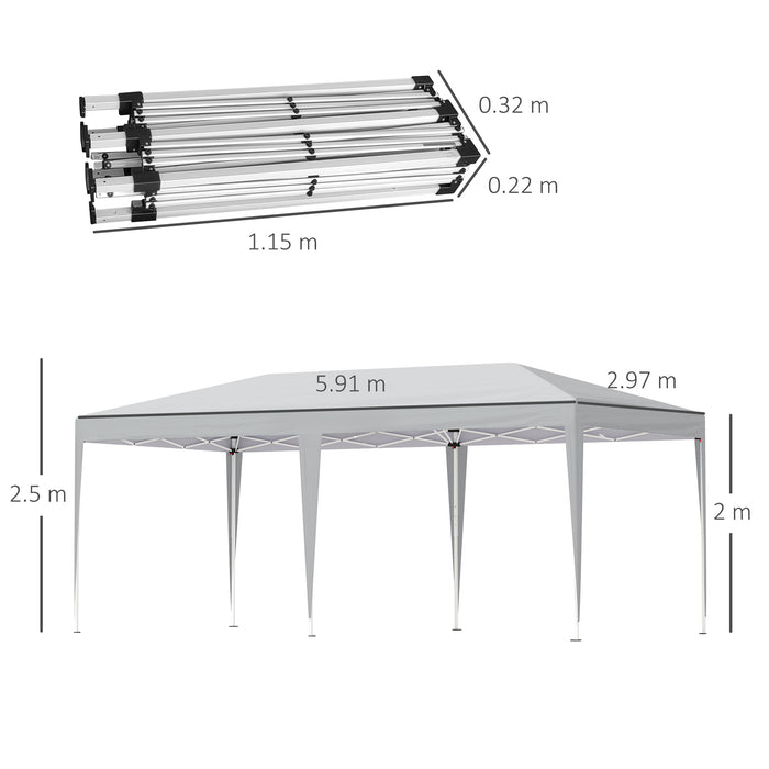 The grand size ensures ample space for guests to mingle and relax under the protection of the gazebo—measuring an impressive 591L x 297W cm, with a variable top height up to 265H cm, and eave standing at 200H cm. The product also folds down efficiently into a compact size of just 32L x 22W x 115H cm, making it effortless to transport and store.