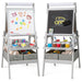 Colour: Grey Material: MDF, Fabric Product Dimensions: 54 x 46 x 101 cm (L x W x H) Size of Chalkboard/ Whiteboard: 37 x 34 cm(L x W) Size of Paper Roll: 5 m x 38 cm(L x W) Size of Each Fabric Bin: 38 x 20 x 11 cm(L x W x H) Suitable Age: 3-6 Years Old Recommend Height: 80-130 cm Net Weight: 8 kg Box QTY:1 Package Includes: 1 x Kids Easel 3 x Paint Cups 1 x Paper Roll 2 x Fabric Drawers 1 x Instruction Manual