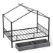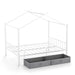 This double size house-shaped bed not only sparks the imagination but also creates a comforting atmosphere, making bedtime an eagerly awaited event. For storage convenience, the spacious drawers with zippered covers keep a variety of items organized and clutter-free. The rugged metal construction is reinforced with middle support legs, ensuring stability and strong load bearing. Moreover, the slatted bed frame not only provides reliable mattress support, but also eliminates the need for a box spring. All in all, this metal bed provides a wonderful sleeping solution for kids while incorporating practical storage space and robust build quality. Unique House Bed: This whimsical bed frame, shaped like a house, is a playful addition to any child's bedroom. Adorned with light strips, ribbons and curtains (not included), this double size bed exudes a whimsical charm that sparks imagination and creativity. 2 Drawers for Storage Convenience: The metal house bed features 2 fabric drawers that neatly tuck away toys, clothes, or bedding, keeping room organized and clutter-free. Besides, the zippered covers shield items, and the drawers can be folded when not in use. Sturdy and Stable Metal Construction: Crafted with 12 closely spaced metal slats, this heavy-duty metal platform bed supports up to 300 kg. Moreover, the middle metal legs offer additional stability, ensuring a solid foundation. No Box Spring Needed: The enduring metal slat system provides reliable mattress support while eliminating the need for a box spring. The metal house bed fits a 10 cm thick double size mattress. Modern and Practical Design: Ideal for boys and girls, the house-shaped bed not only serves as a cozy sleeping space but also doubles as a creative play area. Its clean lines and modern style add a different flair to any kid’s room.