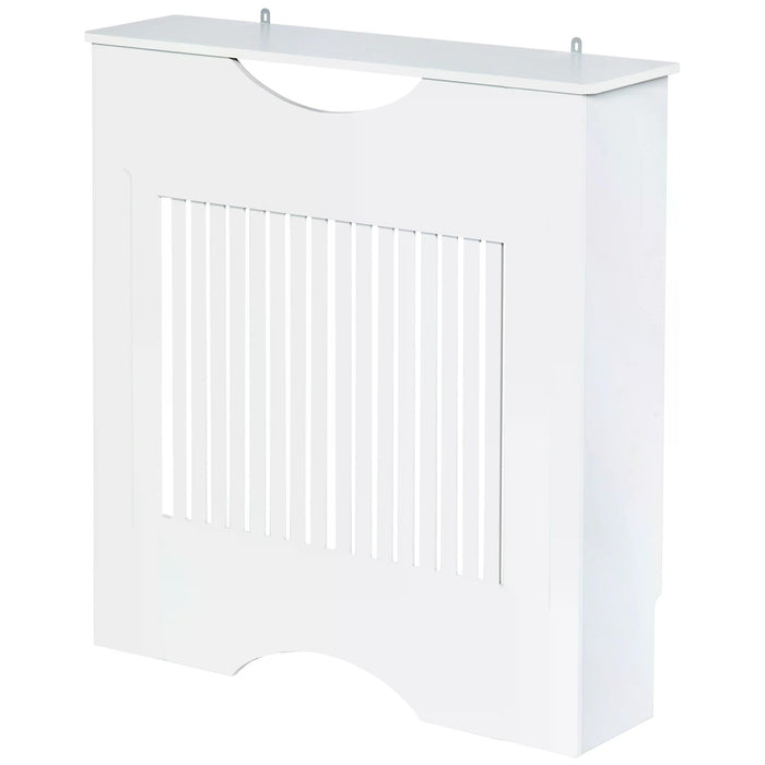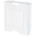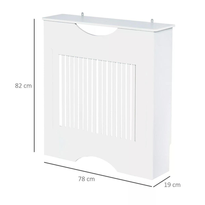 The radiator cover is presented by HOMCOM, featuring a high-quality E1 class MDF structure in a singular, crisp white color. Its exquisite design is geared towards efficiency, safety, and aesthetic appeal. Each unit is shipped flat-packed, inclusive of a unique product label: 820-149 for easy identification and a quick setup experience.