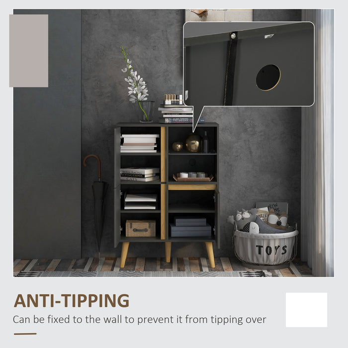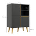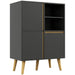 The robust wooden legs provide a solid foundation for the cabinet, ensuring durability and stability. Their natural finish adds a warm contrast to the dark grey body, offering a touch of rustic charm to the modern design.