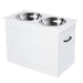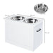 The pet feeder features convenient handles on either side, making it effortless to lift and relocate. Beneath the bowls, it boasts a spacious hidden compartment for storing your pet's food and supplies, ensuring a tidy space and easy access whenever it's time to serve dinner.