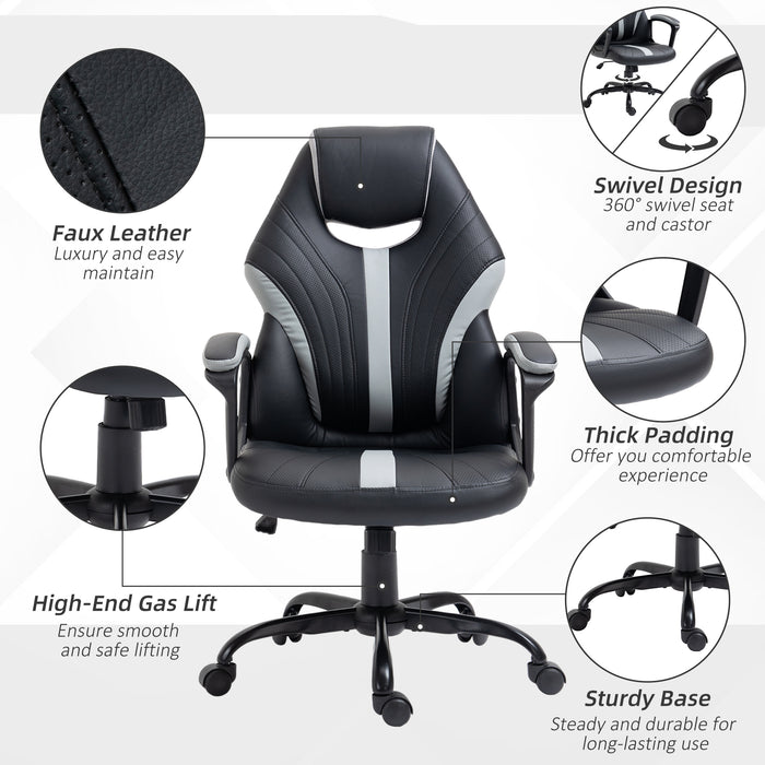 Our chair is enveloped in premium PU leather that boasts a sleek look and easy maintenance. Complementing the striking appeal are colorful panels with ventilated sections that pique interest while promoting air circulation for added freshness. Every inch is thoughtfully padded with high-density foam offering unrivaled comfort from the substantial seat to the mid-rise armrests and the elongated, supportive backrest.