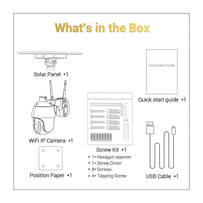 Solar Panel*1,WIFI Camera*1,Screw Kit*1,USB Charging Cable*1,User Manual*1, Position Paper*1, |