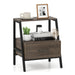 The bedside table comes with a tabletop and open shelf to meet different storage needs. Below the shelf, a handy drawer with metal slides provides additional space for books and other sundries, making it both practical and accessible. Constructed with reinforced metal frame, this night table ensures sturdiness and longevity. The addition of adjustable foot pads allows for stability on uneven surfaces. This farmhouse end table is designed to bring functionality right to your bedside or sofa side. Perfect Home Organization: Featuring a wide top area and open shelf, this nightstand keeps nighttime essentials or decorative items organized. Besides, the pull-out drawer provides ample concealed storage space for personal items. Sturdy and Stable Structure: Crafted with power-coated metal frame and stable trapezoidal structure, the bedside table boasts durability and strength. The adjustable foot pads improve higher stability, making it a reliable choice for long-lasting use. Captivating Farmhouse Style: Styled to suit a farmhouse aesthetic, this end table seamlessly blends with existing decorations. It serves as an element that can enhance the overall charm and warmth of your interior. Multi-scene Usage: The 3-tier nightstand with drawer strikes a perfect balance between style and practicality. This piece fits seamlessly beside your bed or next to the sofa, offering a stylish storage solution. User-friendly Design: The drawer is equipped with smooth metal slides for easy operation. A convenient handle allows for effortless opening and closure. With 11 cm raised height from ground, the side table offers easy access for floor cleaning.