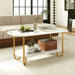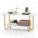 Elevate your living space with our exquisite coffee table, featuring a luxurious faux marble tabletop and a stunning golden frame that adds a touch of opulence to any room. Crafted from premium plates with a waterproof surface, this table is not only elegant but also durable for long-lasting use. The heavy-duty steel frame ensures stability, making it perfect for holding your essentials. With a versatile 2-tier design, you can store coffee cups, plants, laptops, magazines, or consoles conveniently. The rust-resistant powder-coated metal parts guarantee durability, while the 4 anti-slip foot pads provide floor protection and extra stability. Bring both style and quality to your home with this chic coffee table. Bullet Point: Modern and Chic Look: Our coffee table features a faux marble tabletop that can easily create a luxurious atmosphere. The golden frame makes the coffee table look more sophisticated. This stylish coffee table is suitable for different styles of home. Premium Materials and Stable Structure: This coffee table is made of high quality plates and it has a smooth, waterproof surface that you can easily clean it with a wet towel. The heavy-duty steel frame gives the coffee table a very stable structure and good weight-bearing capacity up to 50kg. Spacious Tabletop and 2 Tiers Design: Our coffee table features a wide tabletop for your coffee cups, potted plants or laptops. Moreover, the double tier design makes this coffee table more practical. You will get an extra large storage space where you can put magazines or consoles. User-friendly Details: The metal part of the coffee table is processed with powder coating, which can effectively prevent rust and increase the service life of the product. The coffee table has 4 anti-slip foot pads at the bottom, which can protect the floor while add stability. Suitable for Various Occasions: Combining functionality with style and durability, this modern coffee table is perfect for a variety of decorations and is a must-have for any living space. You can use it in any living room, bedroom or reception room to increase the functionality.