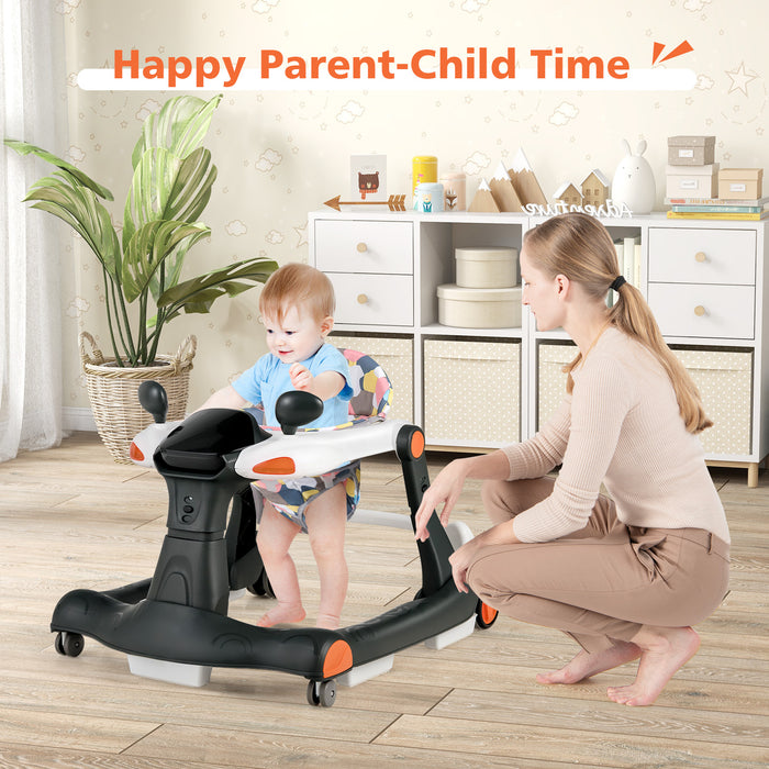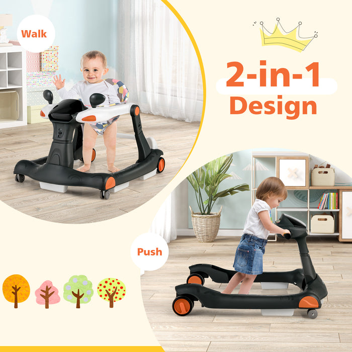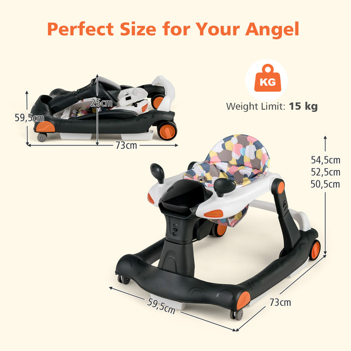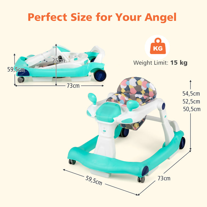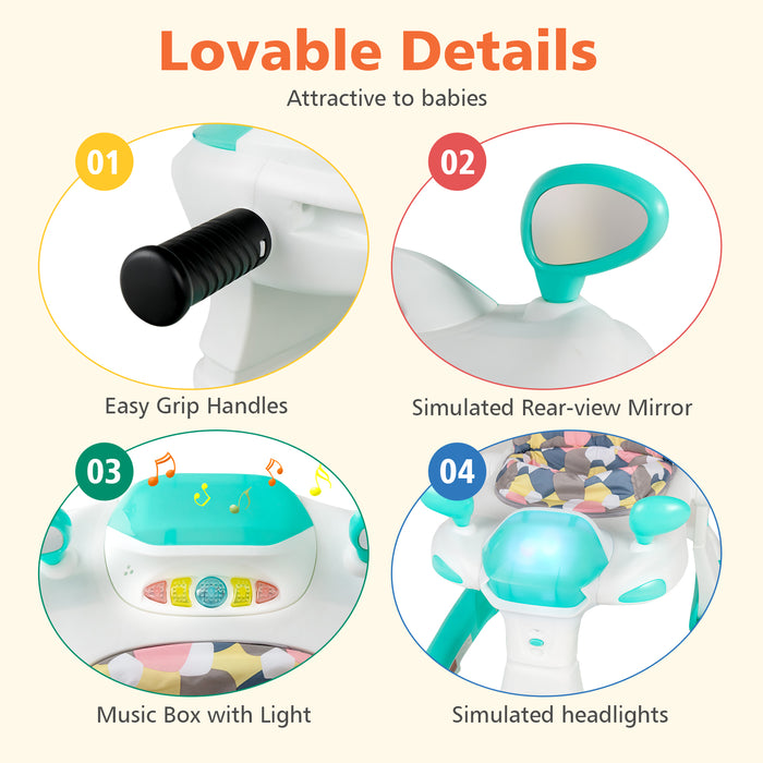 Featuring an interactive racing car design that somewhat mirrors a kid-friendly dashboard, the 2-in-1 baby walker is ready to ignite your little one's creative play and cognitive development. So much more than just taking steps, it's a fun-packed journey equipped with five illuminated buttons, two rearview toy mirrors, and a melody box! Get ready for incredible engagement and joy as your little one explores, plays, and learns (requires 2 AA batteries, not included).