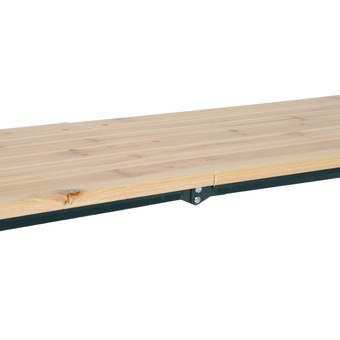 The table and benches boast beautiful fir wood tops, finished naturally to resonate with the great outdoors while providing a resilient surface for all your dining needs. You’ll find the wood’s finish not only exudes charm but also offers a smooth, easy-to-clean surface that stands up to spills and splatters.