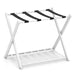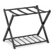The top shelf of this rack comfortably handles a variety of suitcase sizes, including 22", 24", and 26" models, facilitating easy access for packing and unpacking. Below, a versatile shelf awaits to hold your shoes, additional hand luggage, or even a storage basket, making organizing your travel essentials effortless. Constructed with a robust X-shaped frame with non-slip foot pads and equipped with wide-nylon straps, our folding luggage rack stands firm, securing your belongings confidently. Elevate your space and travel experience with this essential folding luggage rack. 2-Tier Spacious Storage: This folding luggage rack features a versatile bottom shelf ideal for storing shoes, hand luggage, or a storage basket. Convenient Luggage Elevation: Accommodate your suitcase easily on the top tier, suitable for a variety of sizes including 22”, 24”, and 26”. Elevate your packing experience with this thoughtfully designed suitcase rack, making it easier to pack and unpack clothes.Good and Enhanced Stability: Rely on unparalleled stability with this luggage rack's robust, stable X-shape frame and wide-nylon straps that ensure your belongings stay securely in place. The non-slip foot pads and tight connection prevent any wobbling or tipping.Easy to Fold and Store: This rack is easy to fold and occupies minimal space when not in use, making it an ideal storage solution for both homes and hotels, promoting a clutter-free environment effortlessly. With the upgraded design, it is easy to assemble.Multifunctional Use: Use this durable rack at home to keep suitcases organized or as an extra space where you can sort or display items. Its elegance and utility make it a valuable addition to any room.