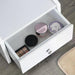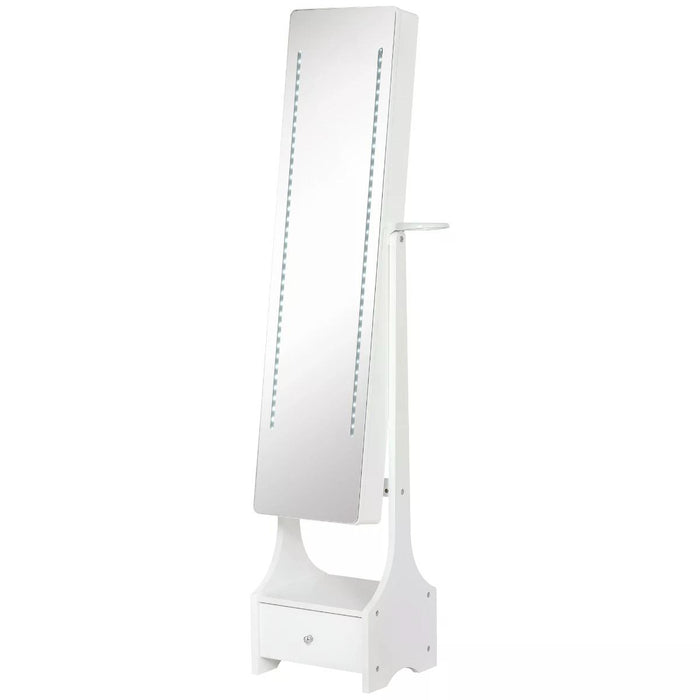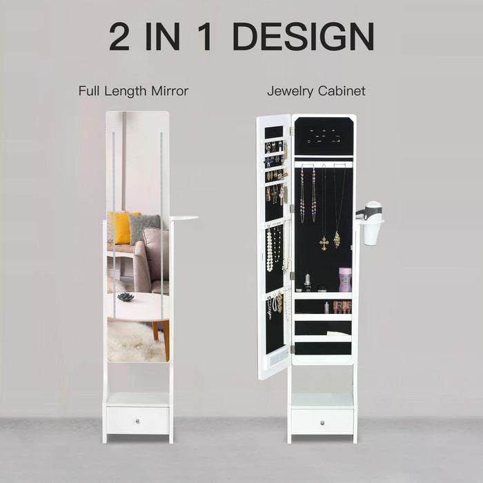 The interior of this stylish piece is a treasure trove of organization possibilities. Housing an impressive 56 earring slots, 15 hooks for necklaces and bracelets, and 77 rings slots, it ensures your pieces are neatly displayed and within reach. Additional perks include ample shelving, a commodious bottom drawer, and an external hairdryer holder to streamline your prep time.