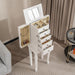 This jewelry cabinet boasts 4 layers and three different types of compartmentalized drawers, offering abundant space to neatly organize your earrings, watches, and various other jewelry pieces. Moreover, enhance functionality by taking advantage of the additional storage space provided by this cabinet. Besides, the side hanger is thoughtfully designed with safety ropes, ensuring effortless and tangle-free storage for your long necklaces. Furthermore, conveniently access smaller items with the discreet hidden storage compartment. Moreover, safety is the priority, which is why this cabinet includes an anti-tipping device and non-slip pads to prevent accidental flipping. Furthermore, crafted from high quality board, this cabinet seamlessly blends style and longevity, making it ideal for everyday use. Multi-Use Jewelry Cabinet: This 4 layered jewelry cabinet offers ample storage space for your jewelry collection. Moreover, features 3 types of different drawers with slot for rings and earrings, this cabinet ample storage space to organize your various jewelry effectively. Extra Storage Solution: This cabinet includes a flip-up container for easy access to smaller items like rings and earrings. Besides, the necklace holder on the side provides efficient storage of long and short necklaces. Enhanced Stability: Designed with anti-tipping device, this freestanding jewelry armoire secure wall straps prevent the risk of toppling and tipping over. Moreover, the stable wooden feet with non-slip footpads ensures high stability to secure safe storage of your valuable jewelry collection. Multi-Use Jewelry Cabinet: Crafted from premium materials, this jewelry cabinet seamlessly blends into any interior space such as bedrooms, living rooms, dressing rooms, or cloakrooms, adding a touch of elegance to your indoor decoration. Thoughtful Cabinet Details: Designed with convenience in mind, this jewelry cabinet features a built-in vanity mirror, allowing you to effortlessly match your jewelry. And it also includes a secure magnetic door catch, ensuring that your precious collection is safely stored. Additionally, the convenient drawer handles provide easy access your jewelry.