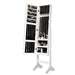 Elevate your room decoration with this luxurious freestanding jewelry armoire featuring a dazzling frame adorned with resin diamonds. Stay organized with ease using this jewelry organizer, offering ample storage with multiple earring slots, earring stud holes, hooks for necklaces and bracelets, ring slots, and storage shelves. This versatile storage solution is perfect for the bedroom, cloakroom, entryway, and more, which combines functionality with aesthetic appeal. Luxurious Full-Length Mirror: Adorned with a sparkling frame of resin diamonds, the freestanding jewelry armoire will elevate your room with a touch of elegance. This piece not only serves its functional purpose but acts as a stunning piece of decoration, enhancing both your style and sophistication. Ample Storage Capacity: You are able to organize and declutter with ease using this standing jewelry armoire, equipped with 56 earring slots, 52 earring stud holes, 19 hooks for necklaces and bracelets, 60 ring slots, and 3 storage shelves, ensuring every piece is neatly organized and within easy reach. Sturdy and Stable Structure: Crafted with high-quality MDF material, this jewelry organizer provides excellent balance and stability with its robust design, ensuring it stands firm without tipping or wobbling. Versatile Placement: More than just a storage solution, this standing jewelry cabinet doubles as a captivating home accessory that enhances the ambiance of your room, providing both functionality and aesthetic appeal. It is suitable for your bedroom, cloakroom, entryway, etc. Easy to Assemble: This floor standing jewelry organizer comes with a pre-assembled cabinet and detailed instructions, and you only need to install the legs before using, which enables quick use and enjoyment.
