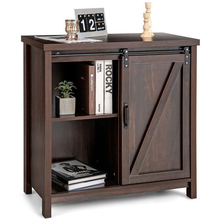 Foregoing traditional hinges, this contemporary buffet cabinet incorporates a sliding barn door, merging rustic charm with modern practicality. Effortless in operation, the glide of the door on its smooth metal track allows for quick and convenient access to your belongings without compromising on style.