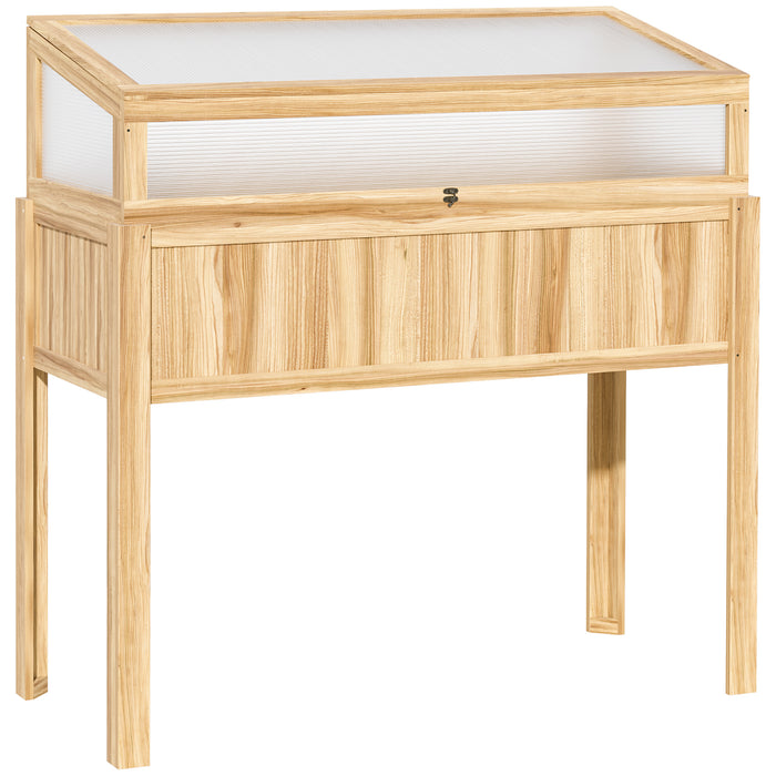 Our raised garden bed features a robust framework crafted from solid fir wood, enhanced with a protective coating to withstand the rigors of outdoor weather. The meticulous design includes a sloped, openable roof made from transparent polycarbonate panels, ensuring that your plants receive ample sunlight while offering the conveniences of temperature control and weather protection.