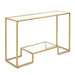 Dual-layered with impeccable tempered glass shelves, our table offers a transparent look that exudes a sense of airiness and cleanliness. These sturdy surfaces present a charming stage for showcasing your decorative pieces, books, or refreshments. The open bottom shelf serves an additional layer of organization for your assorted belongings, keeping them within reach yet orderly.