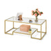 This 2-tier coffee table dazzles with its high-gloss glass tabletop and contrasting golden/black metal frame—a perfect centrepiece for a contemporary living room or modern office setting. The dual transparent glass layers add a fresh, modern vibe to your decor. Crafted from high-strength tempered glass, the tabletop offers a smooth, moisture-resistant surface for easy maintenance, with a heavy-duty steel frame coated with rustproof powder for increased lifespan.