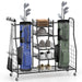 This heavy-duty metal golf bag stand has a large capacity to securely hold 2 golf bags and other golf accessories, such as golf balls, golf clubs, shoes, towels, caps, etc. The side golf club holder allows quick access to your clubs and can be easily installed on either the right or left side, depending on your preference. Additionally, the inclusion of 4 universal wheels enhances the mobility of this golf bag storage rack. Two of these wheels are lockable, ensuring the rack stays in place once positioned. All-in-One Golf Organizer Rack: Equipped with 2 golf bag holders, 1 mesh storage basket for golf balls, 4 open shelves for shoes or other accessories and 1 storage tray for golf clubs or flags, this golf bag organizer is an ideal storage solution for all your golf equipment. User-friendly Design: The removable golf club holder can be installed on either the right or left side of the rack based on your needs. In addition, the open shelves are thoughtfully designed with raised edges to prevent items from falling. Enhanced Mobility: This golf bag storage rack comes with 4 universal wheels, making it easy to move from one place to another. Besides, 2 of the wheels can be locked to prevent unwanted movement. Robust Metal Construction: Constructed from a heavy-duty powder-coated metal frame, this golf bag storage organizer ensures unparalleled stability, load capacity and durability. Wide Application: Designed to maximize space efficiency and reduce clutter, this large golf bag stand is a practical addition for various occasions, including your home, garage, basement, golf club and more.