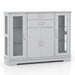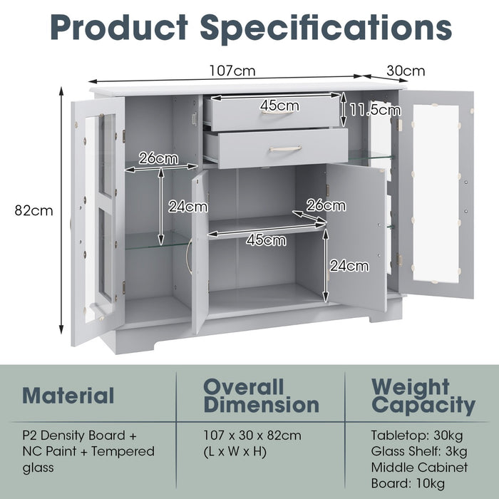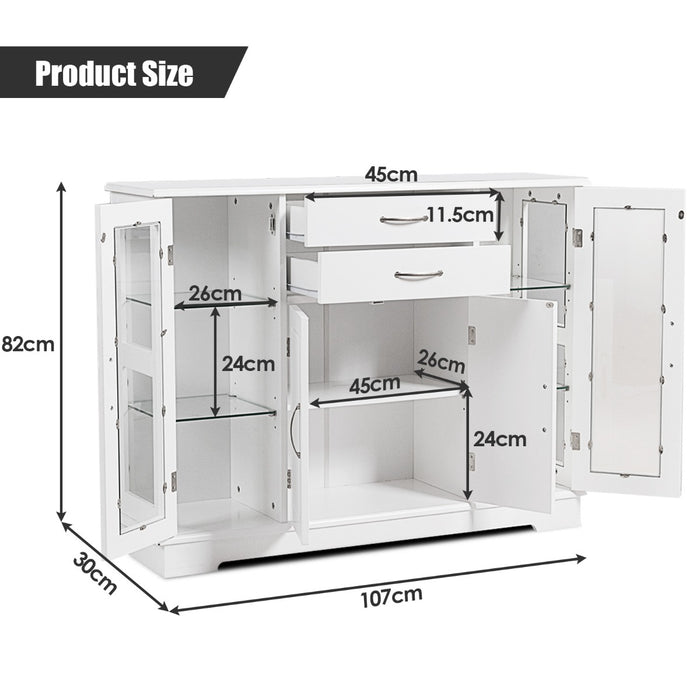 Discover the convenience of customizable storage with this chic sideboard. Equipped with a spacious top surface, it's an ideal stage for your treasured items or festive decor. Featuring two smoothly operating drawers, this sideboard makes accessing your essentials effortless. Centered between two elegant glass-doored cabinets, the double-door cabinet emerges as a versatile space for your dinnerware or books. Experience the flexibility of five inner shelves, three of which offer adjustable positioning to accommodate your varying storage demands.