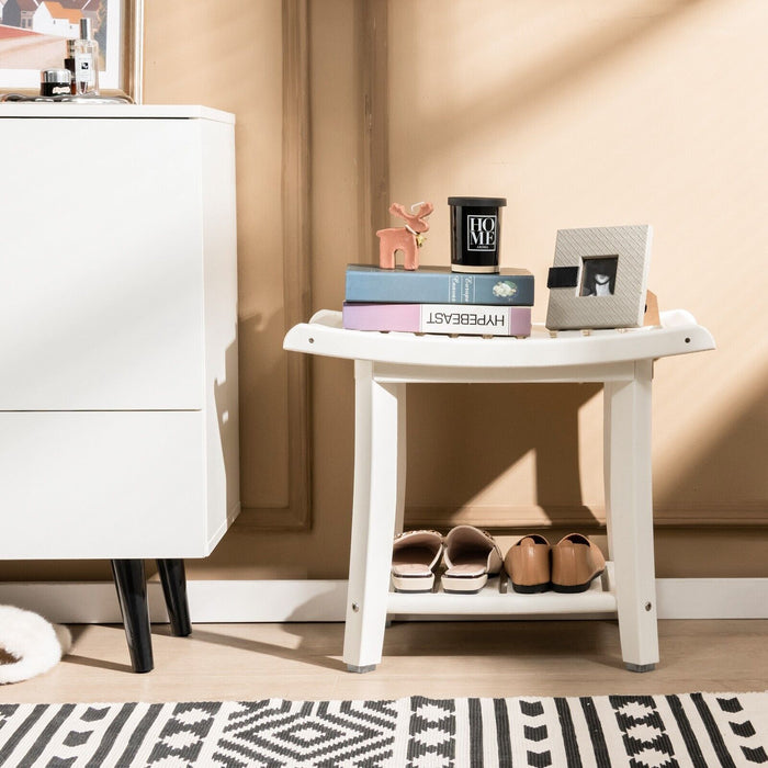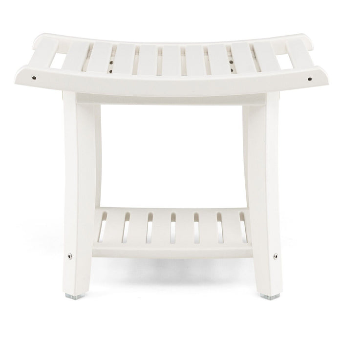 The shower bench features a curved seating structure for added comfort and round corners for safety. Burr-free edges amplify the safety, making it the perfect companion to assist you in your shower. Adding on to its versatility, we have incorporated a 2-tier design. This offers abundant storage for your bathing essentials or anything else you may wish to place on it. Its adaptability extends beyond the bathroom. With its elegant look, it can fit right in your bedroom, living room or at the entrance.