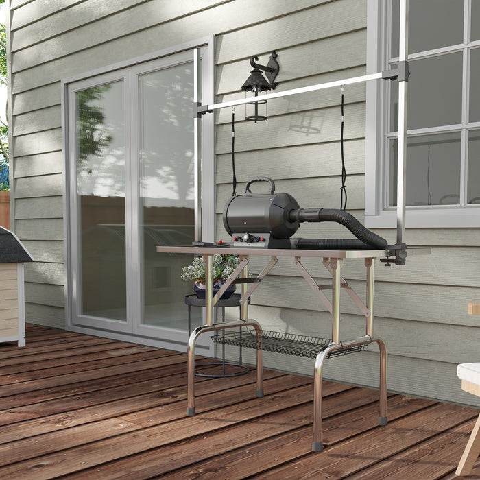 Sculpted with a dependable metal structure, the foundation of this table provides a resilient and robust base for your pet grooming activities. Stability is further enhanced by strategically placed rubber feet pads, which firmly grip the surface to prevent any sliding mishaps during use.