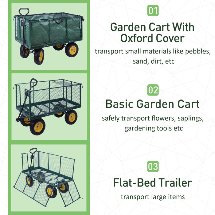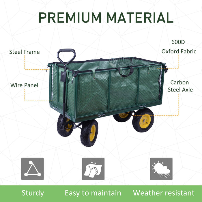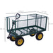 Finished in a dark green hue, this utility wagon not only prides itself in function but also in form, effortlessly blending with your garden landscape. Our cart is more than a simple accessory; it's an essential multi-purpose vehicle ready to enhance your gardening projects, transport tools, or become a reliable companion for various outdoor events.