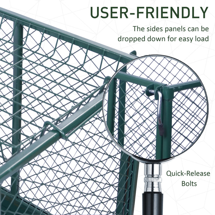 Our garden cart is engineered with a solid steel frame, robust wire side panels, and a hefty carbon steel axle, allowing it to support up to a staggering 350kg load. The construction foregoes a run-of-the-mill build for a structure that ensures longevity and reliability. Whether it's hefty gardening supplies or rigorous outdoor materials, our cart stands the test of load and time.