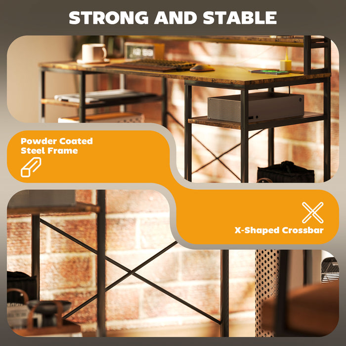 Transform your workspace with the HOMCOM computer desk with storage, designed for both style and functionality. It features a built-in charging station with two power outlets and two USB ports, keeping your devices powered up and organised. Customise the ambiance with RGB LED lights and enjoy the ergonomic monitor stand that promotes comfort with lots of storage options, including shelves and CPU stands. This HOMCOM writing desk helps you keep your home office or study area tidy and efficient.