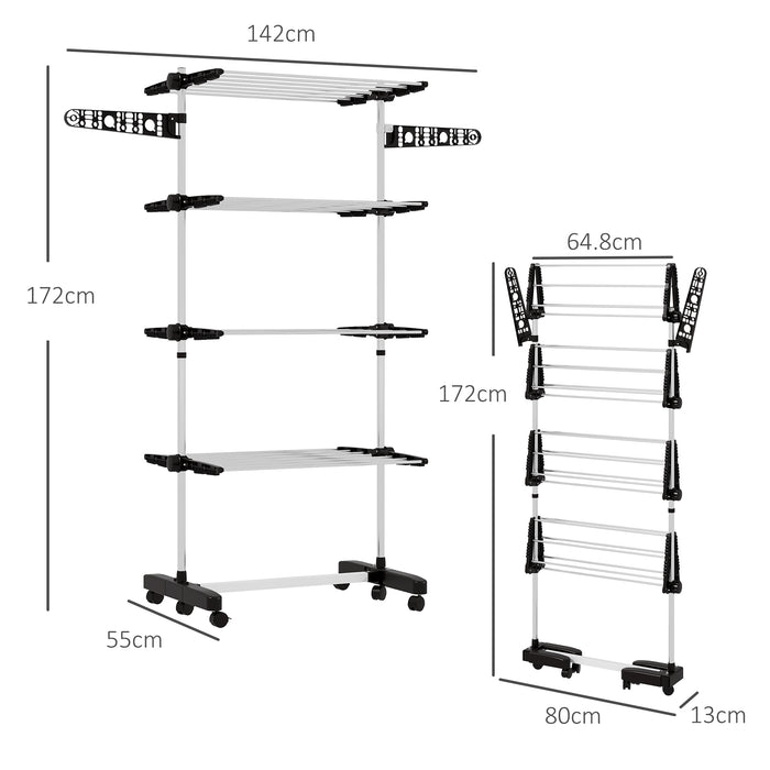 Easy clothes drying, with plenty of just-washed items thanks to this HOMCOM clothes horse. The multi-rack design comes with four middle shelves and two rotating wings: plenty of room for clothing. All levels, plus the legs, can be moved downwards/inwards to ensure it can be compactly stored. Six wheels to move it around easily, this laundry rack comes with two brakes so it stands stationary in place.