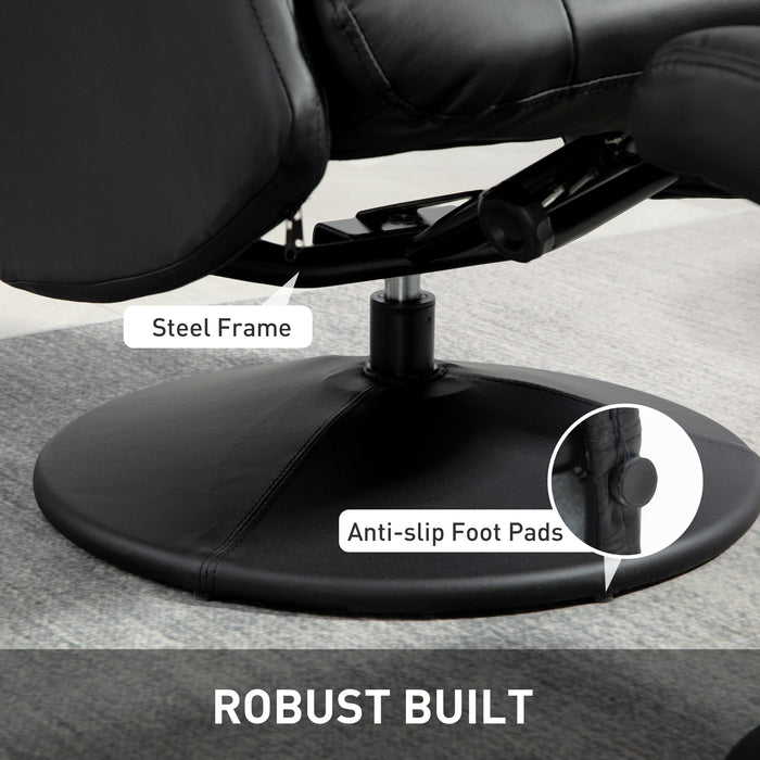 Sink into luxury with the HOMCOM armchair and footstool set. Featuring a plush 10cm thick cushion and sleek PU leather upholstery, this living room chair invites you to unwind in style. With a 130° adjustable reclining back and 360° swivel, this comfy chair optimises relaxation. The high back and flared armrests offer additional support for a truly serene experience.