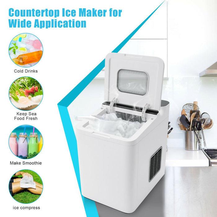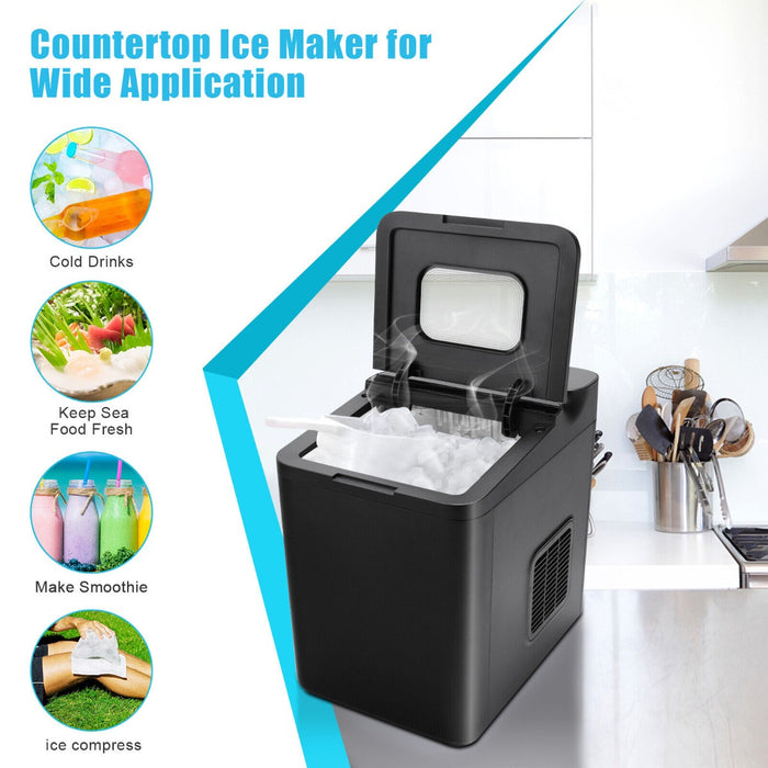 The package includes an ice maker, an ice scoop for sanitary dispensing of ice, a drainage plug, and an instruction manual to guide your operations.