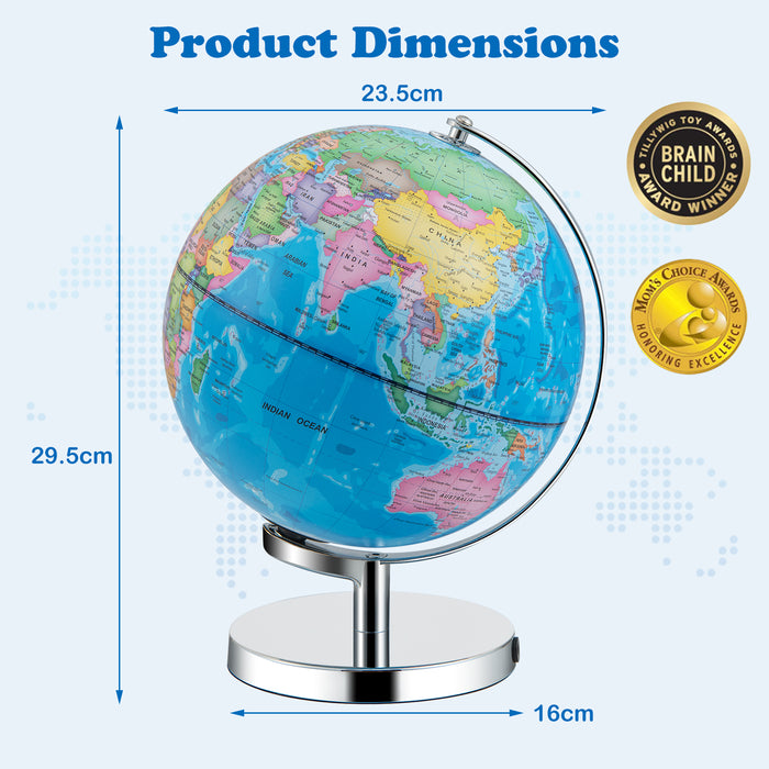 This globe is built to last, featuring a sturdy metal frame and a heavy-duty base that resists tipping and ensures stability. The high-quality ABS plastic sphere is durable and crafted to withstand daily learning activities. It's a fun, educational, and engaging way to build cognitive skills and problem-solving abilities in children.