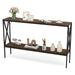 Measuring 120 x 23 x 74 cm (L x W x H), the entryway table is designed to fit seamlessly into narrow spaces. The 2-tier foyer table easily accommodates decorations, vases, scented candles, and even storage basket, reducing clutter while enhancing the aesthetic of your entryways, living rooms, or hallways. Boasting a heavy-duty metal frame and premium boards supported by an X-shaped structure, the hall table provides a reliable platform for your valuables. Additionally, 2 anti-toppling kits further enhance its overall stability. Ideal for stylish organization, this narrow sofa table can be a showstopper in your living space. Industrial Charm: The combination of natural wood grain with a matte black metal frame adds a touch of industrial flair to your living space. This chic design makes the narrow console table a perfect match for both rustic and contemporary interior styles. 2-Tier Storage and Display Space: Featuring 2 open shelves, this long sofa table offers ample storage and display space for your collections, vases, candles, storage baskets, or other decorations. It helps reduce clutter while adding glamour and functionality to your living space. Sturdy and Stable Construction: Crafted with robust metal frame and premium boards, this 2-tier foyer table provides a reliable support for your valuables. Moreover, the X-shaped support structure and 2 anti-toppling kits enhance its overall stability. Suited for Various Settings: Measuring 120 x 23 x 74 cm (L x W x H), the slim foyer table fits impeccably in narrow spaces without compromising on style or functionality. Ideal for entryways, living rooms, or hallways, its compact size ensures practical use while maximizing your space efficiently. Easy Assembly and Maintenance: This industrial entryway table comes with clear and concise instructions for a hassle-free assembly. Additionally, its easy-to-clean surface offers effortless maintenance, ensuring your table looks pristine with minimal effort.