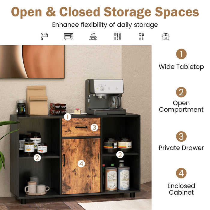 The expansive top surface is ideal for housing your microwave, coffee machine, or cherished family photos, thus keeping your counters free of clutter. Below, a harmonious blend of four open shelves, a smooth-gliding drawer, and a generously-sized cabinet with a sleek door, ensures that everything from your fine china to your napkins finds a discreet and accessible home.