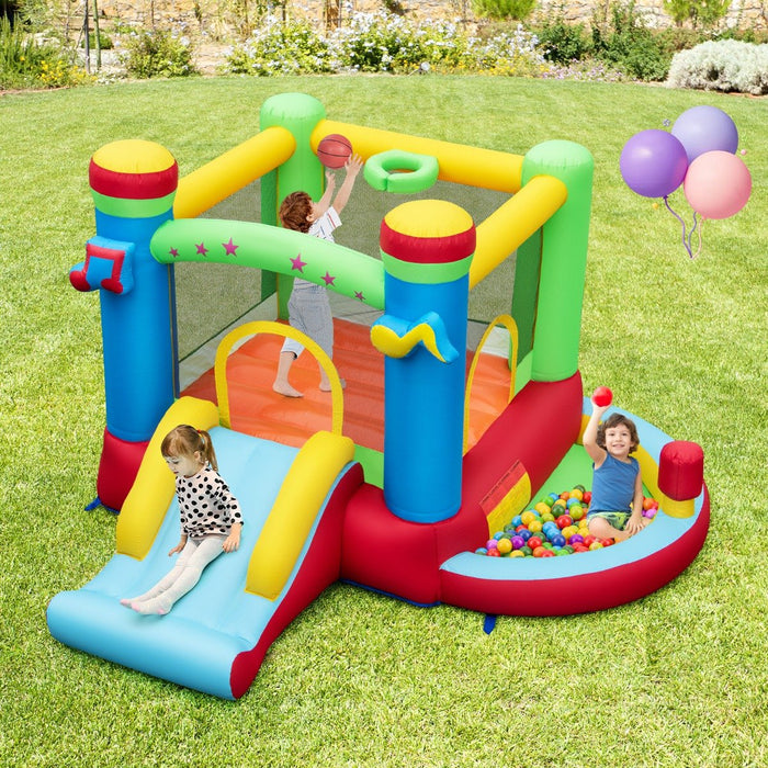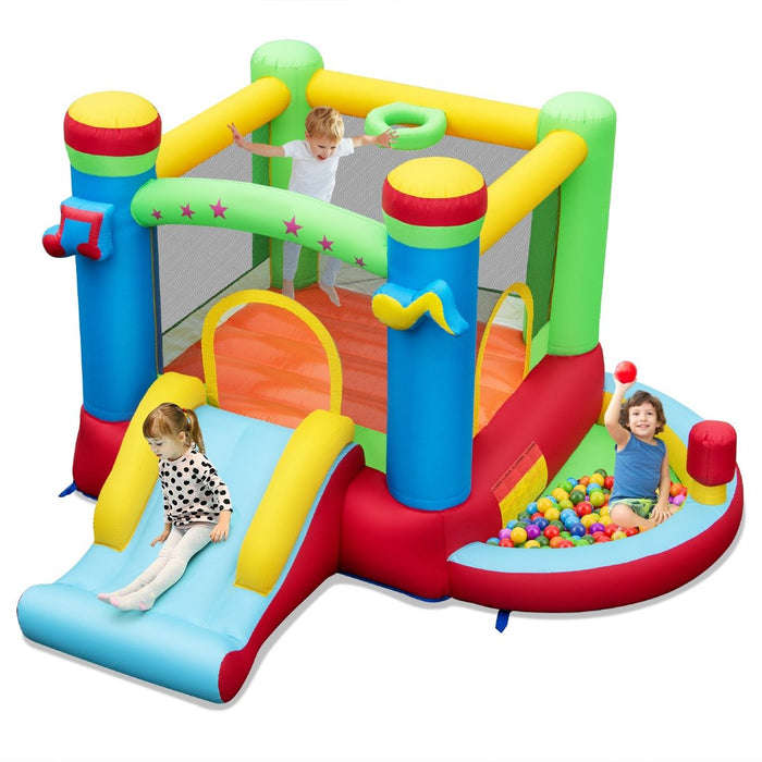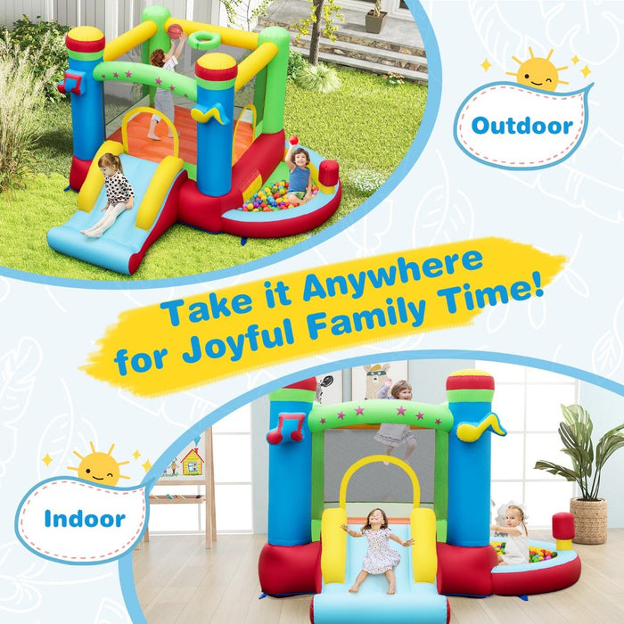 Step into a world of bouncy fun! The large jumping area and smooth slide boast a versatile play center for every child. The basketball hoop and boxing provide a great outlet for playful competition, and the ball pit area offers an amusing corner for younger children to enjoy. We care all the details. Constructed with abrasion-resistant 420D oxford cloth and surrounded by mesh protective wall, this inflatable bouncer ensures long-lasting and reliable usage. Perfect for indoor or outdoor settings, this bouncer is designed to captivate young minds and encourage physical activity. Moreover, this bounce house comes with everything needed for a hassle-free setup and maintenance. Note:1.The product needs a constant supply of air from the blower (which inevitably produces some noise). It is normal that some air coming from the fabric surface and seams.2. Please make sure the product is completely dry before storage.3. Please keep it in dry and ventilated place when not in use.4.Please keep the blower on during use. Bullet Point: Step into Musical Playground: This music-themed inflatable castle is designed to delight your little ones, perfect for parties, family gatherings, or daily fun in the yard or lawn. The jumping area offers plenty of space for bouncing fun, while the attached slide adds an extra thrill. Not Just Jumping Joy: In addition to bouncing and sliding, the bounce house includes a basketball hoop, a ball pit and boxing area, providing kids with different play and exercise options that promote physical coordination, balance, and interactive fun. Built to Last, Safe to Play: Crafted from tear-resistant 420D oxford cloth and fortified with double stitching, the inflatable bouncer provides a secure play area for children. Additionally, the mesh protective wall adds an extra layer of safety and visibility. Make Inflation and Storage a Breeze: This kids bouncy castle inflates in minutes (recommended for use with 480W blower, not included), ensuring a fast and easy setup process. After deflation, the carrying bag allows for convenient storage and transportation. Complete Accessory Kit: The 5-in-1 blow-up bouncer is equipped with 4 ground stakes for additional stability and a pack of repair kit for any unexpected punctures. Note: Suitable for kids aged 3-12 years old and bears individual weight up to 45 kg.