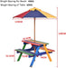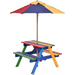 Introducing a delightful addition to any playground or backyard - a colorful children's picnic bench designed to offer your young ones a charming spot to engage in playful activities or enjoy a refreshing beverage. With a protective parasol to keep them comfortably shaded from the sunny rays, this robust and vibrant table set invites endless hours of fun and relaxation.