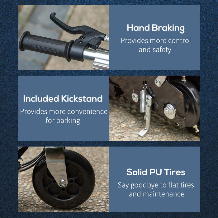 Our scooter's hand-activated rear brake system provides superior braking capability for added safety. The brake disengages the motor automatically, offering peace of mind during use. Forget flat tires and tedious maintenance thanks to our robust 15cm solid PU tires engineered for a smooth and uninterrupted ride.