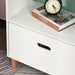 The sturdy wooden legs anchor the shelf firmly to the ground, promoting stability and safety, while the natural wooden accents beautifully contrast the pristine white body, adding a touch of warmth to any room. The bookshelf stands proud at a sizeable 142 cm in height, 50 cm in length, and 30 cm in width, with each leg raising the frame by 10.5 cm for a lifted look.