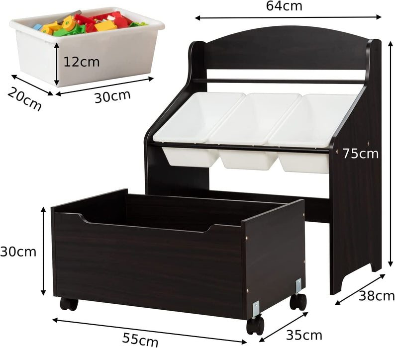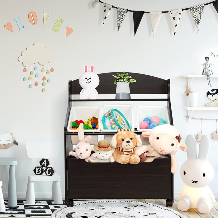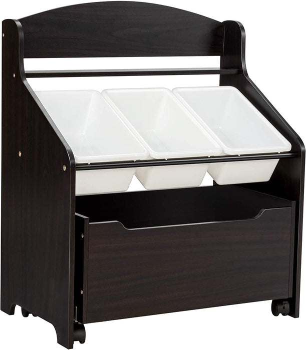 At the heart of this organizer are three removable plastic bins perfect for sorting smaller items like action figures, building blocks, and craft supplies. Additionally, the spacious bottom compartment, equipped with smooth-gliding wheels, invites children to store bulkier items such as dolls, board games, and stuffed animals. Above, a convenient shelf serves as a neat spot for your child's favorite books and keepsakes, ensuring a well-organized room.