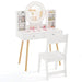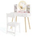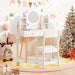 This vanity table with lighted mirror will make kid’s daily dress-up routine more enjoyable. With 2-color lighted mirror, kid’s cute face can be clearly seen. And you can press the button to switch light color between white and yellow. Boasting a large tabletop, open storage shelves and 2 wide drawers, the vanity table offers ample storage space to organize kid’s cosmetics, trinkets, toys, books etc. Thickened boards with solid wood legs support make the table long-lasting for use. Considering kids’ safety, we also provide anti-toppling device to fix the desk on the wall to avoid tip-overs. Matched with a cute chair, the kids vanity table will be great addition to child’s bedroom or study. Bullet Point:2-Color LED Lighted Mirror: The round mirror of the vanity desk is equipped with LED lights to provide kids with a realistic make-up feeling. Kids can simply press the button to change the light color: white and yellow. Note: Require 3 AA batteries (Not Included). Classified Storage Space: The kids makeup vanity includes 4 storage shelves, a spacious tabletop, and 2 large drawers, offering plenty of storage space for cosmetics, accessories, toys, books or snacks. Also, flexible storage areas help children develop the good habit of organization. High Sturdiness and Stability: Supported by solid pine wood legs, the dressing table ensures high sturdiness as well as strong load capacity. For children’s safety, the vanity desk is fitted with anti-toppling device to securely fix the desk to the wall to avoid tipping over. More Well-made Details: Unlike normal glass mirror, our shatterproof acrylic mirror is hard to break or crack. The ergonomic chair backrest will let kids sit more comfortably. Plus, the protective rounded edges prevent kids from being accidentally scratched. Ideal Gift for 3+ Years Old: The lovely child-sized vanity table set gives your little girl a perfect place to dress up every day. Complied with UKCA, the dressing table and chair set will be a reliable gift idea for kids aged 3+ years old on birthday or Christmas day.