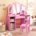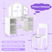 This toddler vanity table comes with a chair and a removable tri-folding mirror so that it can be used as a vanity table or a writing table. The tri-folding mirror includes a large center mirror and 2 sides 180° folding mirrors to reflect clear images in all directions. 4 large storage compartments satisfy kids’ different storage needs. With included anti-toppling device, parents can fix this 2-in-1 kids' makeup vanity set to the wall, preventing tip-over accidents. If you are looking for such a product, do not hesitate to buy it! Perfect Gift for Little Princess: Designed with a removable tri-folding mirror, this 2-in-1 kids' vanity table set serves as a vanity table or a writing desk, meeting kids' different needs. With ASTM and CPSIA certification, parents can buy with confidence. Suitable age: 3+ years old. Clear Tri-Folding Mirror: The princess makeup table is equipped with a tri-folding mirror which is combined by a large center mirror and 2 side foldable mirrors (180°). Plus, the mirror made of HD acrylic is safer compared to glass mirror because it is not easy to break. Considerate and Safe Design: The smoothly rounded corner keeps your kids away from unexpected injuries. The non-slip foot pads also protect the floor from damage. For increased safety, you can use the included anti-toppling device to fix the table to the wall to prevent tipping over or wobbling. Large Storage Capacity: Measuring 104 cm x 40 cm, the spacious desktop provides ample space for displaying kids' favorite collections or various activities. Moreover, the 4 storage compartments are ideal for storing books, toys and more, and the open design allows for easy access. Sturdy Construction and Simple Installation: Made of durable MDF material, this kids' vanity set features outstanding stability, and the table can support up to 220 lbs and the chair can withstand weight up to 110 lbs. The installation is easy with detailed instructions and numbered parts.