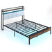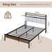 The integrated LED lighting offers adjustable colors, speeds, and brightness to set the perfect ambiance for relaxation. Control these settings effortlessly with the included remote. Additionally, the built-in charging station keeps your devices powered and within reach. Supporting up to 500 kg, the robust metal slats provide a solid foundation. The bed frame is built for stability and noise reduction, incorporating noise-free foam within the slat system. The upholstered headboard offers comfortable back support. Along with storage shelves, this bed frame provides ample under-bed space to store items and make floor cleaning easier. All in all, the industrial bed frame brings a stylish and functional touch to your bedroom. Vibrant Lighting Effect: The industrial bed frame features bright LED light on the headboard for a cozy and well-lit ambiance. Controlled by a handy remote, you can adjust colors, speed, and brightness, or select from dynamic modes to set the mood. Convenient Power Accessibility: This heavy-duty metal platform bed comes with a built-in charging station for easy power access. There are 2 outlets, 1 USB port, and 1 type-C port to keep multiple devices charged. Sturdy and Noise-Free Structure: The combination of closely spaced metal slats and 5 middle support legs casts a firmly constructed platform bed, which can bear up to 500 kg. The noise-free foam on the metal beam reduces friction, ensuring restful night’s sleep. Upholstered Headboard with Storage: Upholstered in premium linen fabric and filled with high-density sponge, the headboard combines comfort with elegance. Besides, 2-tier shelf within the headboard provides extra storage space for bedtime essentials. Optimized for Convenience: The under-bed storage space offers additional room to store items, keeping your living space neat and tidy. Plus, the king size bed frame adopts unique buckle installation to securely fix slats and shorten assembly time.