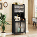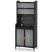 This buffet cabinet features multiple storage options including a top shelf, flip-up cabinets, and a spacious bottom cabinet. Equipped with pegboards, hooks, and a bin for organization, it offers versatile storage solutions. The adjustable shelf, cable management holes enhance functionality. The powder-coated metal structure is built for durability. Its modern design seamlessly complements various decoration styles, making it a stylish and practical addition to your home. Ample Storage Options: This tall kitchen pantry storage cabinet maximizes the space efficiency with a top storage shelf, 2 flip-up cabinets, and a large bottom cabinet. It also features pegboards with 4 hooks and a bin for organizing tools, plus a spacious countertop for food preparation or decorative items. Versatile Organization: The bottom cabinet with an adjustable shelf accommodates items of varying heights. The cable management holes keep electronic appliances tidy, making this cabinet ideal for various kitchen setups. Quality Materials: Made with a powder-coated metal frame for durability, this freestanding storage cabinet also features an easy-to-clean surface. The transparent PC door panels allow you to glance at your supplies without opening the doors. Flexible Placement: This coffee bar storage cabinet can be set up with adjustable foot pads for a stationary position or attached with universal wheels (2 with brakes) for easy mobility, allowing you to move it whenever necessary seamlessly. Simple and Modern Design: This buffet cabinet's clean lines, and minimalist design effortlessly blend with various decoration styles, providing a functional yet stylish centerpiece that enhances the simplicity and harmony of your home.