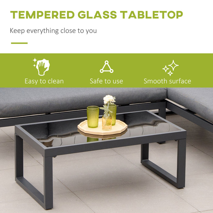 Central to the set is the coffee table, crowned with a tempered glass surface that merges sophistication with rugged tenacity. It's not only a visual treat but also presents a breeze of a maintenance routine, being exceedingly simple to clean and maintain. This focal point of your garden soirees marries functionality with finesse.