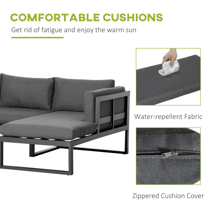 Introducing the epitome of luxury and convenience for your open-air enclaves: a seamless blend of comfort and durability embodied in a stylish L-shaped outdoor lounge set, meticulously designed to enhance your moments under the sun or stars. This versatile configuration includes a plush love seat, an inviting chaise lounge, and a sleek coffee table—the ultimate ensemble for upscale gatherings or tranquil solitude in your personal alfresco retreat.