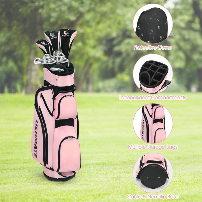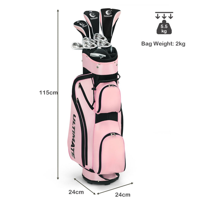 A sleek pink hue accents the set, giving it a personal touch that stands out in a crowd. It includes carbon fiber construction for optimal weight and longevity balanced with aluminum, zinc, iron, TPR, and steel for a premium feel. The package is replete with all the necessary clubs and accessories, guaranteeing you're fully equipped for any golfing situation. Included are the driver, fairway wood, hybrid, irons, pitching wedge, putter, and a user-friendly stand bag.